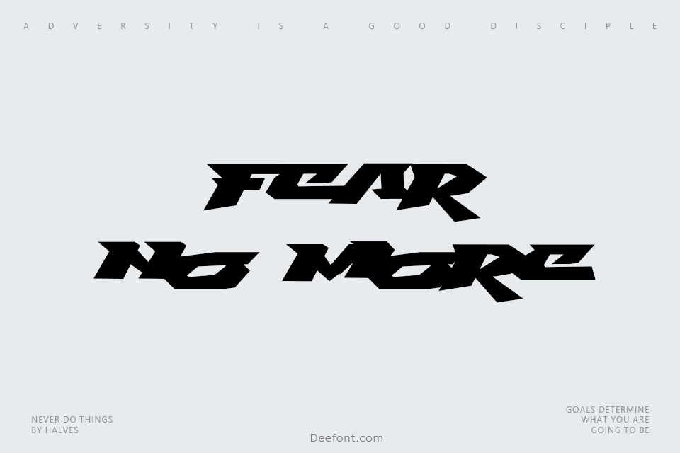 Fear No More is a striking techno display font designed for creative projects requiring bold visual impact. This all-caps typeface features dynamic character forms and geometric precision, making it ideal for gaming titles, anime text, movie posters, and product packaging. The font embodies a contemporary, technology-driven aesthetic with its clean letterforms and strong presence. Perfect for headlines, branding projects, and any design requiring commanding typography, Fear No More delivers modern sophistication with an experimental edge that captures attention and leaves lasting impressions across diverse media applications.
