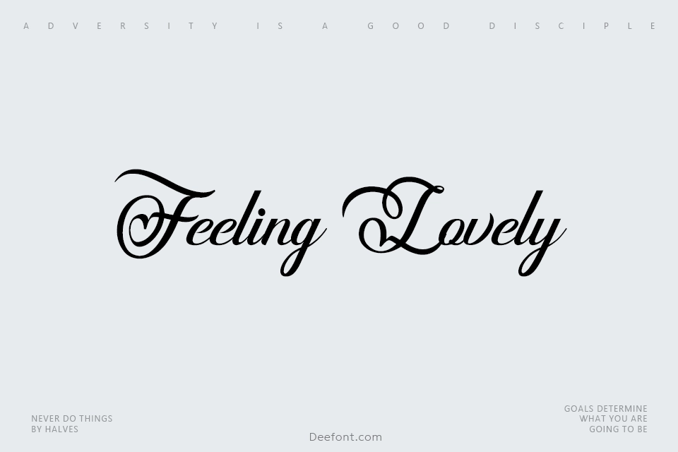 Feeling Lovely Font is an elegant script typeface featuring flowing, cursive letterforms with intricate swirls and decorative flourishes. The uppercase letters showcase ornate embellishments while lowercase letters maintain a smooth, connected appearance creating graceful harmony. Numerals feature complementary flourishes ensuring design consistency. This romantic script perfectly conveys elegance and charm, making it ideal for wedding invitations, greeting cards, luxury branding, formal events, and decorative text applications requiring sophisticated aesthetics and creative expression.