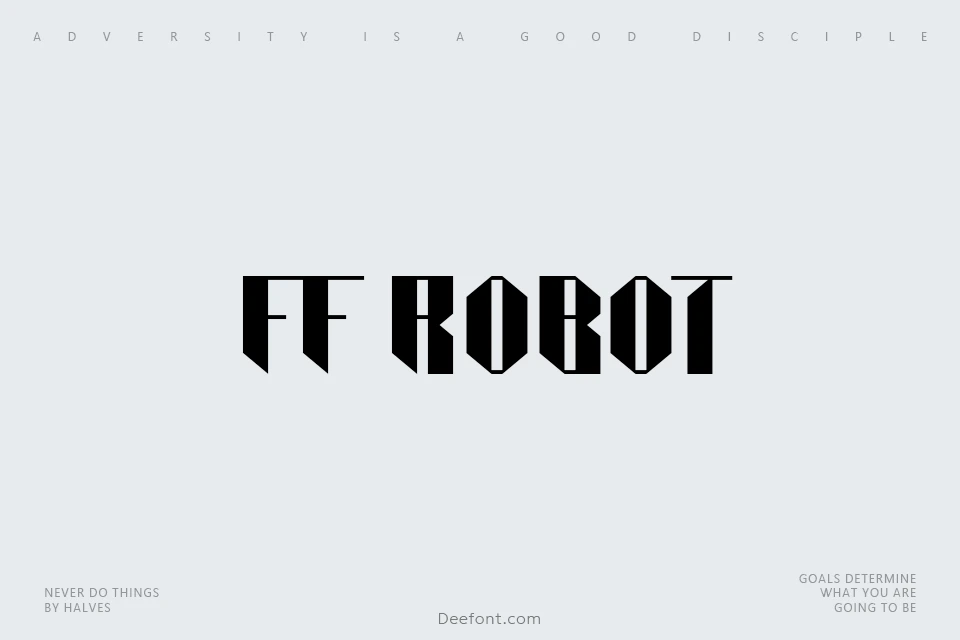 FF Robot Font is a bold and futuristic display typeface designed to capture attention with its strong geometric shapes and sharp angles. Inspired by robotics and industrial aesthetics, this font features distinctive, blocky letterforms that convey a sense of power and modernity. FF Robot is perfect for technology-themed projects, sci-fi posters, gaming graphics, and branding that demands a cutting-edge look. Its unique style stands out in both digital and print formats, making any message feel dynamic and impactful. With its striking presence and innovative design, FF Robot Font is ideal for creative projects that need a bold, contemporary edge.