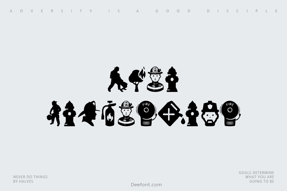 Fire Department is a professional dingbat typeface featuring 236 firefighting-themed pictograms and icon symbols. This comprehensive collection includes firefighters in action, fire trucks, hydrants, axes, flames, safety equipment, and emergency signage. Each symbol is rendered in bold, solid silhouettes designed for crystal-clear visual communication. Perfect for emergency signage, safety manuals, educational materials, infographics, fire department branding, and instructional posters. The font delivers highly recognizable icons suitable for both print and digital applications where fire safety information needs to be communicated instantly.