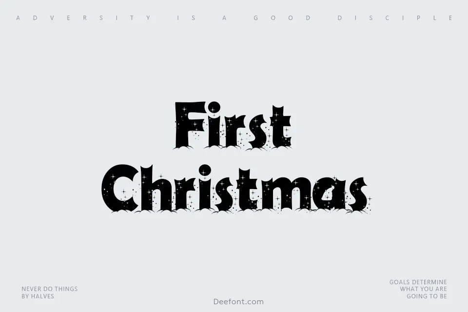 First Christmas is a festive display font designed by LJ Design Studios, featuring a cheerful and decorative style perfect for holiday-themed designs. This charming typeface combines playful letterforms with a Christmas spirit, making it ideal for greeting cards, invitations, posters, and seasonal merchandise. With its distinctive character and versatile applications, the font adds a joyful and celebratory touch to any creative project during the holiday season.
