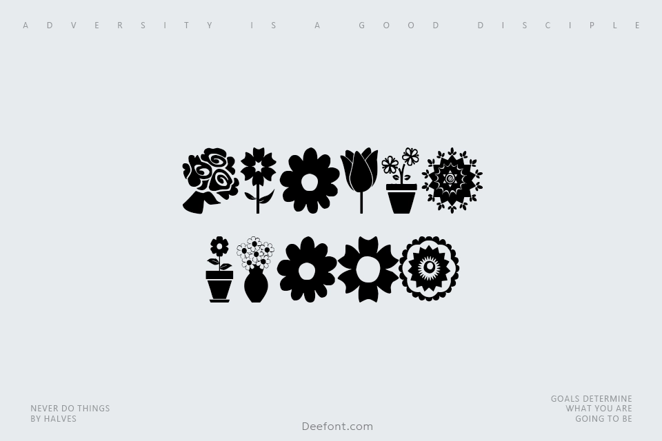 Flower Icons is a delightful dingbats typeface featuring 236 flower-themed icons and symbols, perfect for adding natural beauty to creative projects. Designed by Woodcutter and compiled as vector graphics, this font transforms letters into charming botanical elements ideal for invitations, greeting cards, posters, and decorative designs. With its versatile collection of floral motifs, Flower Icons brings organic elegance to any creative endeavor.