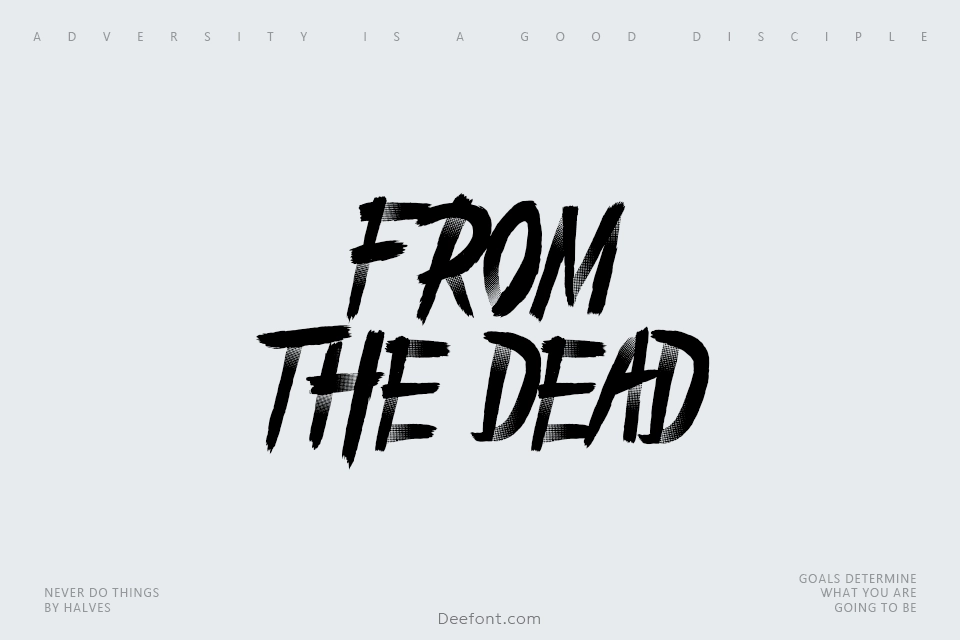 From The Dead is a brush-inspired horror and display font featuring high-energy strokes with spooky edge effects. This uppercase and lowercase typeface excels in horror themes, Halloween designs, grunge posters, branding projects, and edgy creative work. The hand-drawn texture and expressive character set make it perfect for posters, book covers, album art, and designs that demand a striking, supernatural aesthetic. With 69 glyphs supporting basic Latin characters, this font brings dramatic flair to any creative endeavor.
