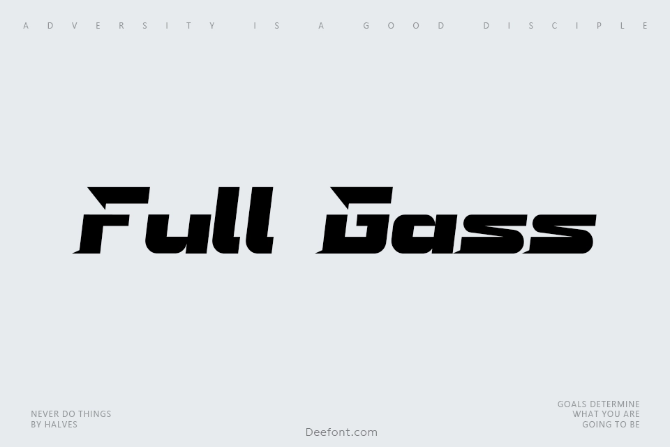 Full Gass is a bold, geometric display typeface designed for high-impact visual communication. With its expanded width, sharp angular shapes, and dynamic character, it delivers futuristic flair perfect for racing-themed projects, modern branding, tech-oriented designs, and sci-fi concepts. The font’s striking geometric forms and sharp angles create powerful visual presence while maintaining excellent readability for headlines, posters, and digital artwork requiring edgy sophistication and contemporary appeal.