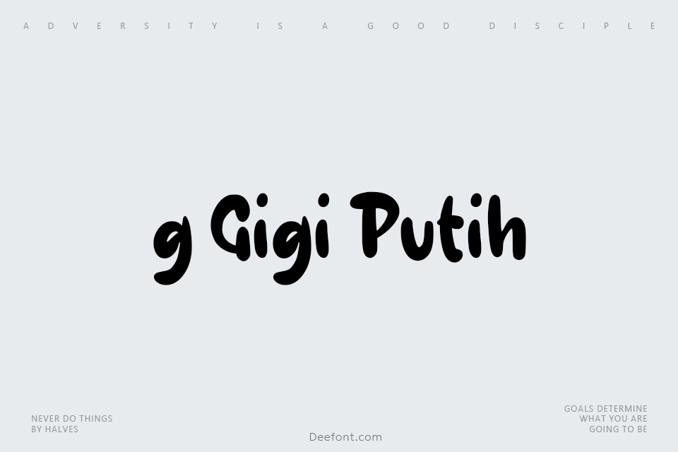 g Gigi Putih is a captivating display font that exudes whimsical cartoon-inspired charm with bold, dynamic strokes. Designed with exaggerated rounded letterforms and a playful, almost handwritten aesthetic, this font commands attention and brings fun and approachability to any design. Perfect for eye-catching titles, logos, playful branding, children’s content, and advertisements, g Gigi Putih offers versatile creative possibilities with its distinctive personality and impactful visual presence.