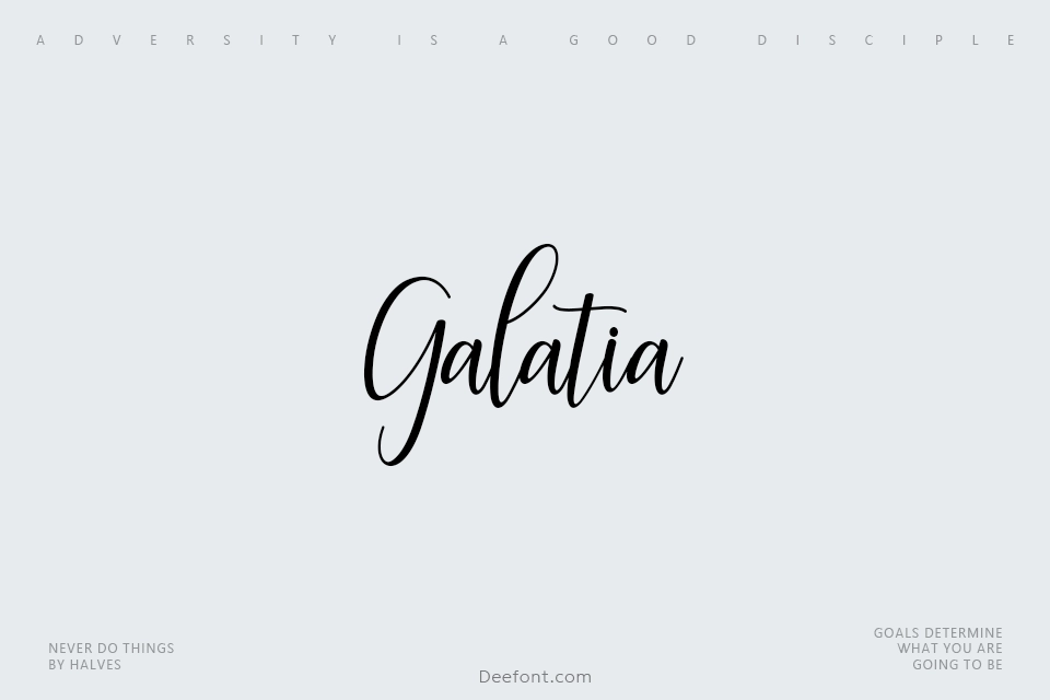 Galatia is an elegant script and calligraphy typeface designed with flowing strokes and decorative flourishes. Featuring 208 glyphs with support for accents and special characters, this versatile font excels in creating sophisticated typography for invitations, posters, branding, and creative projects. With over 440 alternate glyphs accessible through OpenType features like Swash and Stylistic Alternates, Galatia offers designers extensive customization options for refined and artistic compositions.