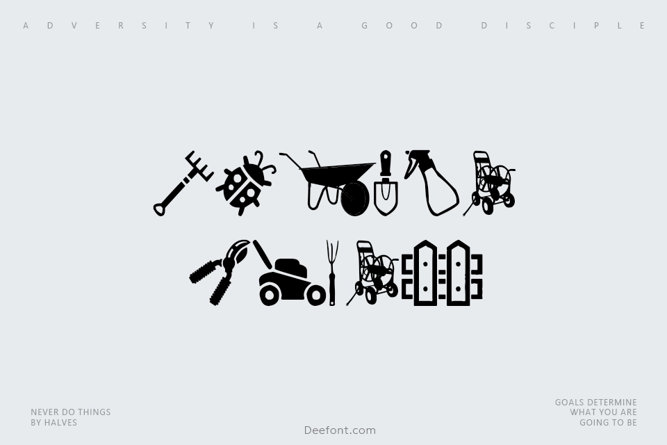 Garden Icons is a versatile dingbat font featuring 234 garden-themed pictograms and icons with bold, high-contrast designs. Perfect for gardening websites, instructional materials, product packaging, signage, and infographics, this decorative typeface delivers playful, illustrative silhouettes of tools, plants, people, and equipment in a easily recognizable style suitable for various sizes and creative applications.