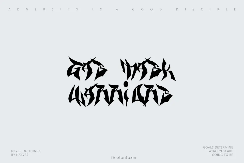 Gas Mask Warriors is an aggressive, edgy graffiti-inspired script font characterized by sharp, angular lines and bold presence. Featuring unique tribal aesthetics with exaggerated serifs and pointed edges, it delivers a rebellious and dynamic feel ideal for music album covers, extreme sports branding, and video game titles. The font maintains consistent style across uppercase, lowercase, numbers and special characters, creating a cohesive, high-contrast design with modern appeal and strong visual impact.