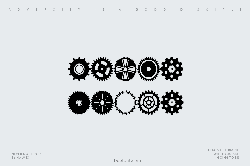 Gears Icons is a comprehensive collection of 236 mechanical gear and cogwheel icons designed in a bold industrial style, perfect for infographics, engineering diagrams, app interfaces, and technical branding. Created by Spanish designer Woodcutter, this dingbat typeface features both solid and outlined gear designs with varying spoke patterns, delivering a mechanical aesthetic ideal for representing machinery and engineering concepts in creative projects.