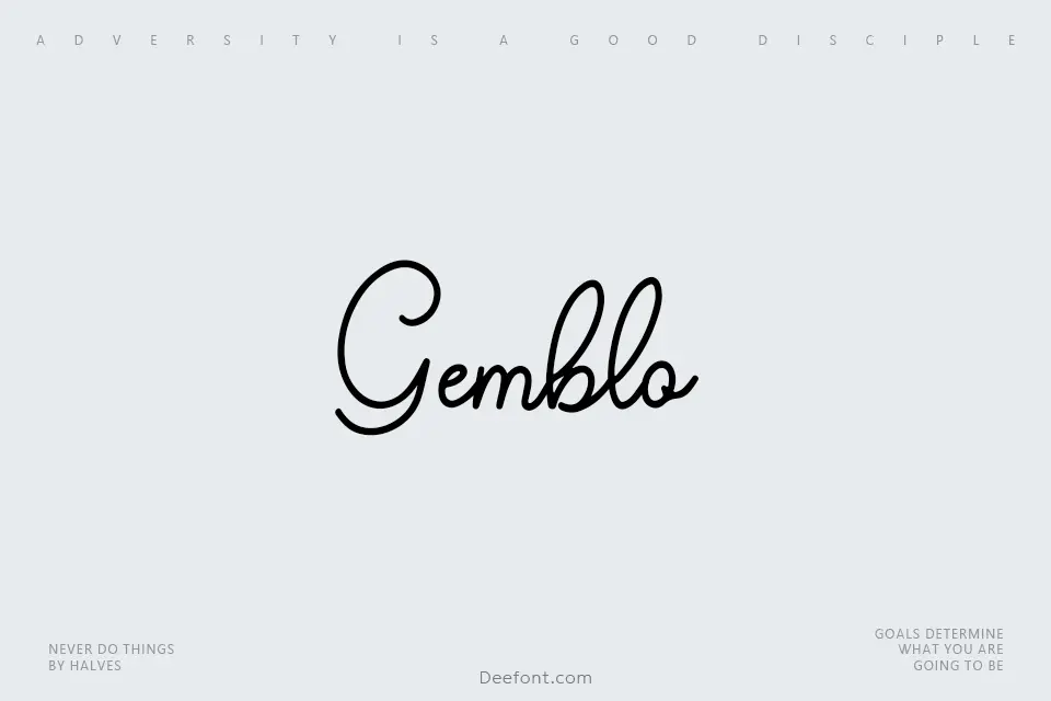 Gemblo is a sophisticated, flowing calligraphy-inspired monoline script typeface that combines graceful letterforms with contemporary minimalist aesthetics. Featuring smooth, connected strokes and refined letterforms, this font excels in elegant applications including wedding invitations, logo design, poster typography, and decorative headings. The consistent pen-width and organic curves create a refined, professional appearance ideal for branding projects, social media graphics, and premium event materials seeking a balance between artistic expression and modern sophistication.