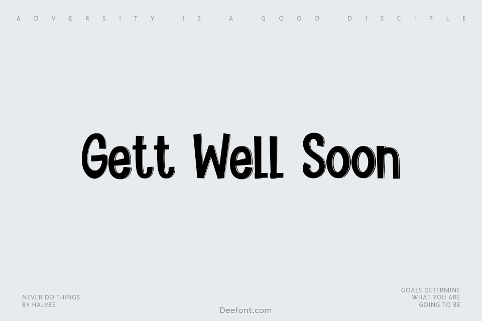 Gett Well Soon is a playful and cheerful display font that brings warmth and positivity to your creative projects. Designed by zainstudio, this whimsical typeface features charming cartoon-like characteristics with rounded, friendly letterforms perfect for greeting cards, get-well wishes, invitations, and motivational designs. With its approachable and uplifting aesthetic, Gett Well Soon combines creative expression with heartfelt messaging, making it an excellent choice for projects that celebrate recovery, joy, and emotional connection.