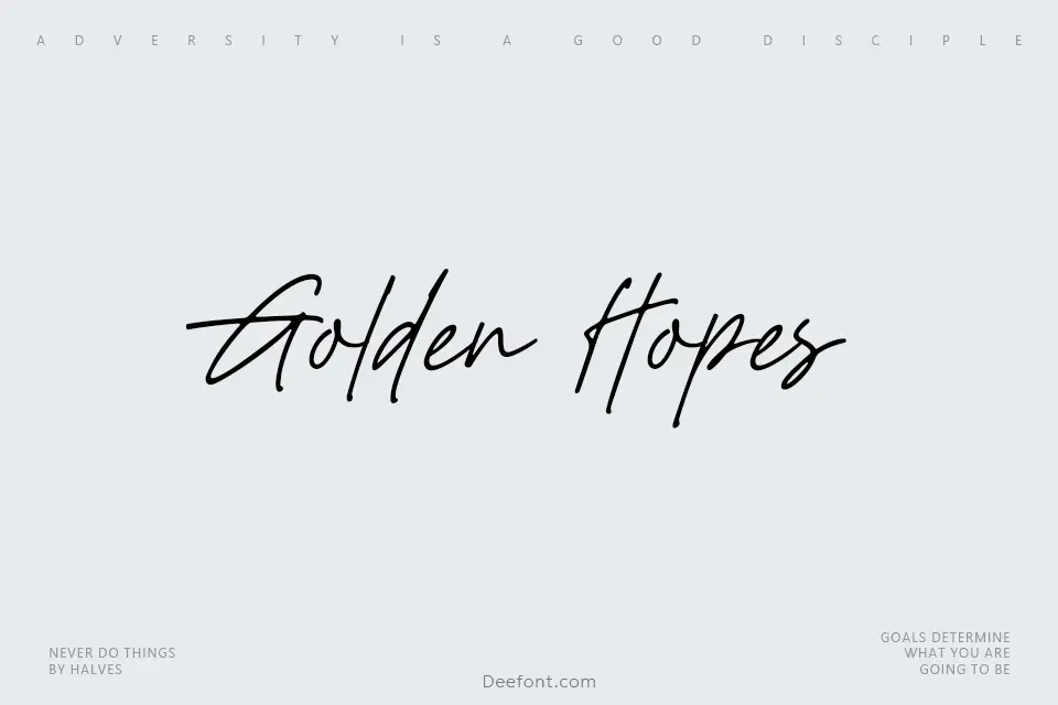 Golden Hopes is a meticulously crafted handwritten script typeface that combines flowing elegance with sophisticated detail work. Featuring beautifully hand-lettered uppercase and lowercase letters, extensive ligatures, and ornamental swashes, this font excels at creating signature logos, photography watermarks, and high-end wedding invitation designs. The typeface’s refined stroke work and graceful curves make it ideal for luxury branding, greeting cards, poster headlines, and decorative typography applications where sophistication and personal touch are paramount.