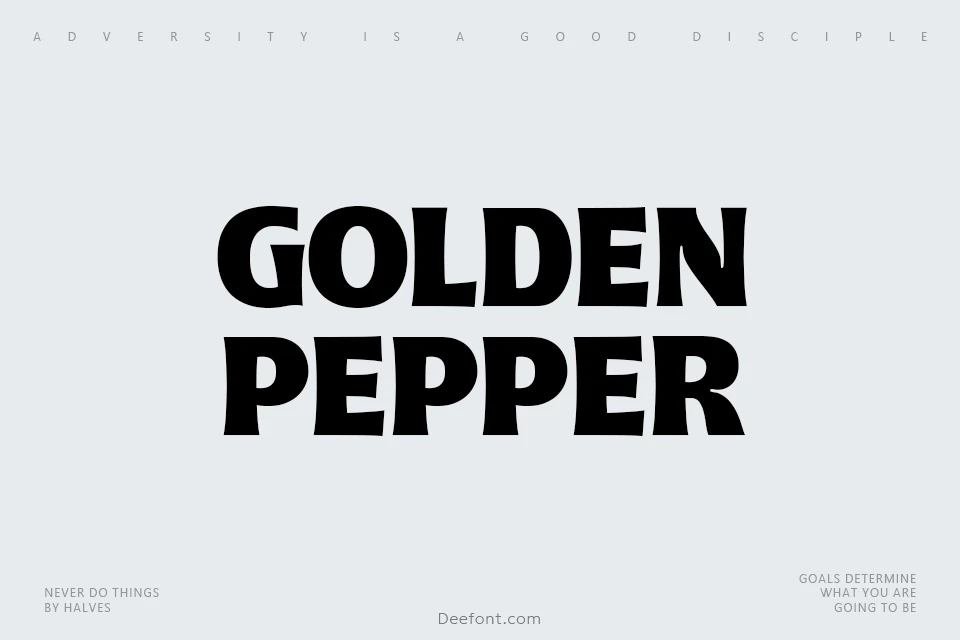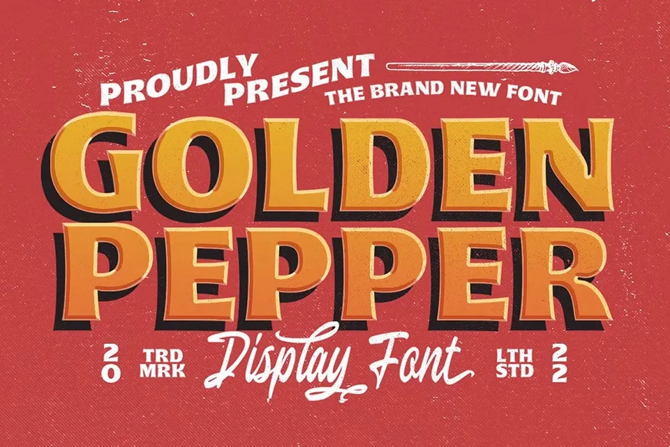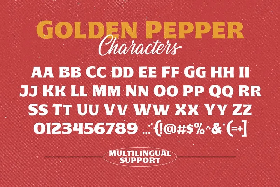 Golden Pepper Font font is a vintage display typeface designed to evoke a nostalgic feel, inspired by classic labels and posters. Its bold and standout appearance makes it ideal for titles, logos, invitations, labels, magazines, books, greeting cards, packaging, fashion, makeup, stationery, novels, and various advertising purposes.