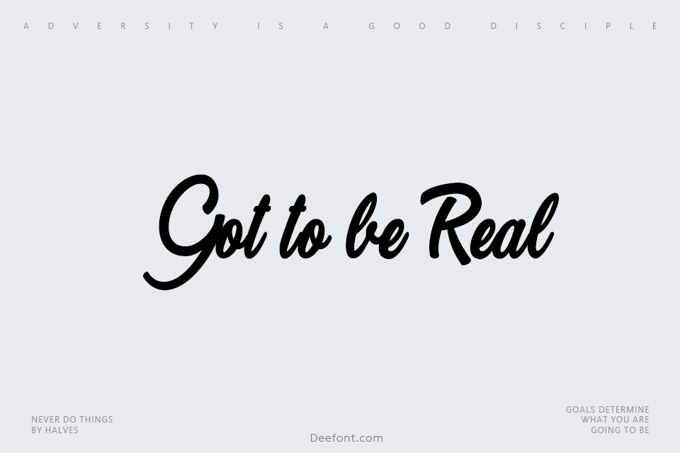 Got to be Real is an elegant script font designed with a charming calligraphic style that combines contemporary flair with artistic expression. This versatile typeface features beautifully crafted letterforms ideal for creative typography projects, invitations, and decorative designs. With its smooth flow and refined aesthetics, it brings sophistication to any visual composition while maintaining excellent readability for various creative applications.