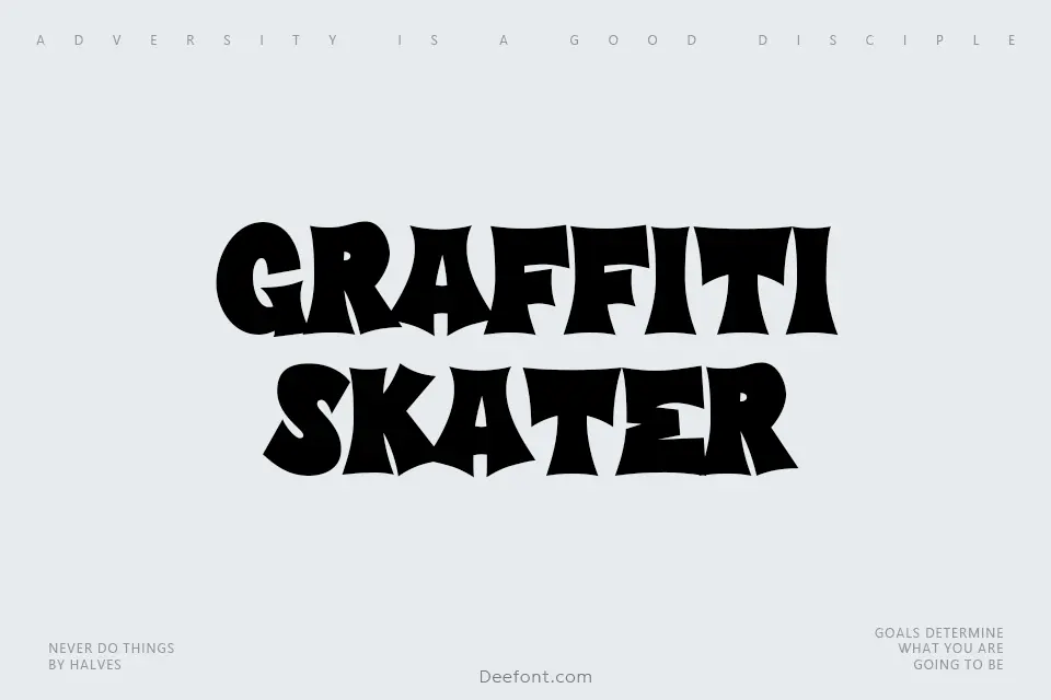 Graffiti Skater is a bold and dynamic display typeface that captures the irreverent energy of street art with edgy, angular characters and unique embellishments. This graffiti-inspired font features jagged edges and an aggressive style resembling spray-painted lettering, making it ideal for urban-inspired designs, music posters, advertisements, promotional materials, and creative branding projects requiring an edgeless, rebellious aesthetic. Perfect for headlines, signage, product packaging, and any design that demands a vibrant, playful, and energetic typographic statement.