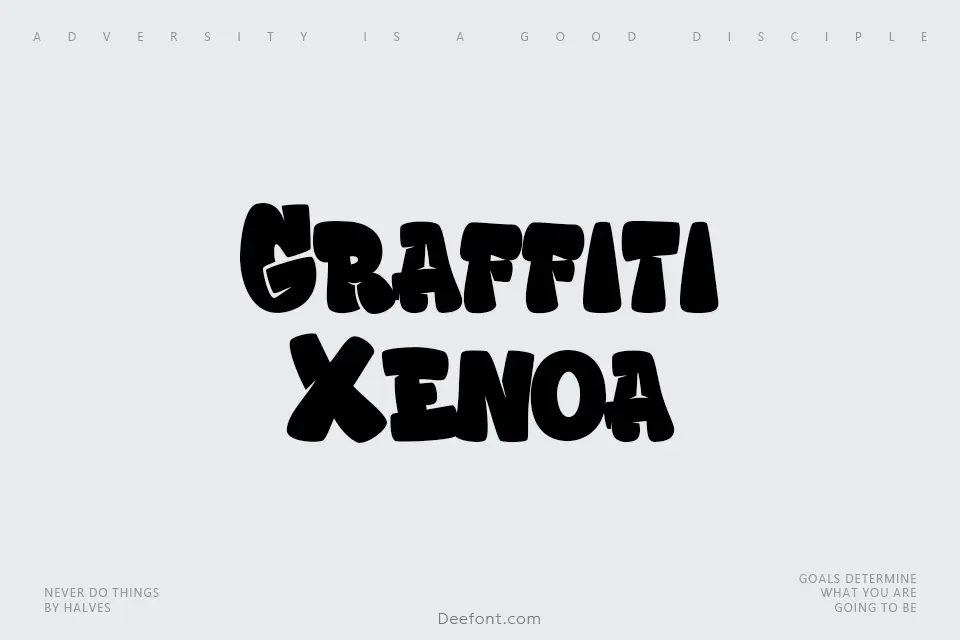 Graffiti Xenoa is a bold, rounded graffiti-style display font characterized by its playful and energetic appearance with thick, bubbly letters. This dynamic typeface features exaggerated curves and an informal look that stands out with movement and energy. Perfect for creative and artistic projects including street art designs, urban-themed posters, music album covers, skateboard designs, and creative branding initiatives. The font maintains consistent style across uppercase, lowercase letters, numbers and special characters with a cohesive design that creates a strong visual impact suitable for headlines and eye-catching displays.