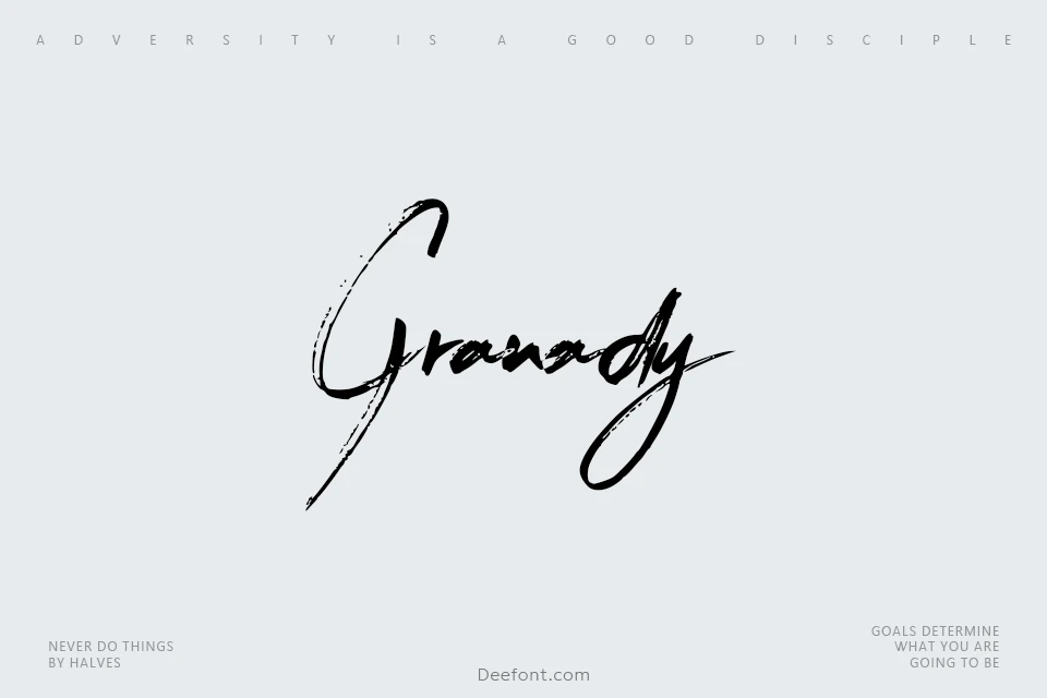 Granady Font is a dynamic brush handwritten typeface featuring expressive, fluid strokes and a natural, slanted character. Its rough texture and playful ligatures make it perfect for logos, branding, letterheads, and creative projects seeking a bold, handcrafted feel.