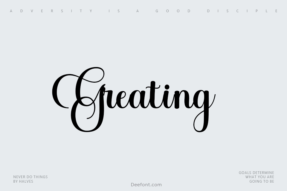 Greating is a modern and elegant calligraphic script font crafted by Romi Rahmadi. This professional typeface features beautiful creative strokes with flowing lines and authentic character variation, making it perfect for wedding invitations, greeting cards, branding projects, and decorative applications. With comprehensive support for uppercase and lowercase letters, numbers, punctuation marks, and multilingual characters, this font brings elegance and sophistication to any design project. The combination of formal calligraphic elements with contemporary aesthetics creates a versatile typeface suitable for both formal and informal creative applications, including logos, websites, banners, and packaging design.