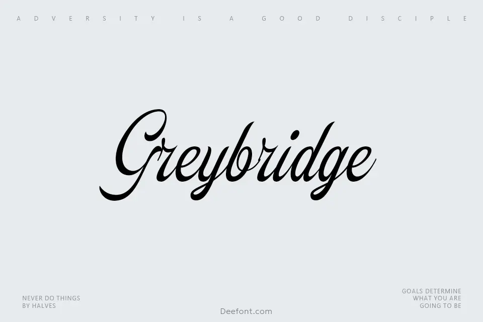 Greybridge is an elegant, old-school script typeface inspired by 1960s and 1970s retro calligraphy and letterpress traditions. This distinctive display font features bold, flowing strokes and decorative flourishes that evoke the craftsmanship of classic penmanship. The typeface excels at creating sophisticated visual impact on branding materials, formal invitations, greeting cards, wedding stationery, labels, and packaging projects. With its rich character set including uppercase, lowercase, numbers, punctuation, alternates, and stylistic swashes, Greybridge delivers timeless elegance for creative professionals seeking authentic vintage typography. Its handwritten aesthetic makes it ideal for logos, poster design, fashion applications, and any project requiring an upscale, nostalgic calligraphic touch.