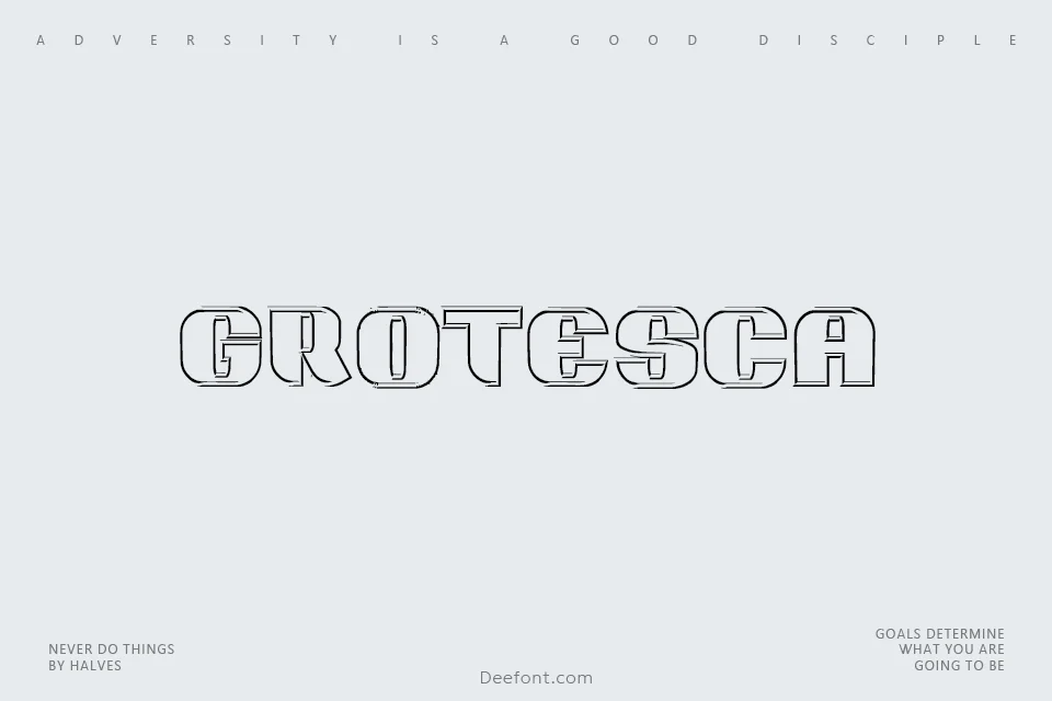Grotesca 3D is a bold techno and display typeface featuring a distinctive three-dimensional geometric style that brings depth and modernity to any creative project. This versatile font excels in headlines, logos, and eye-catching designs, combining technological aesthetics with artistic flair. Its striking outline style makes it perfect for contemporary branding and futuristic applications. The geometric structure and vibrant dimensional effect create an engaging visual impact suitable for both digital and print media.dafont