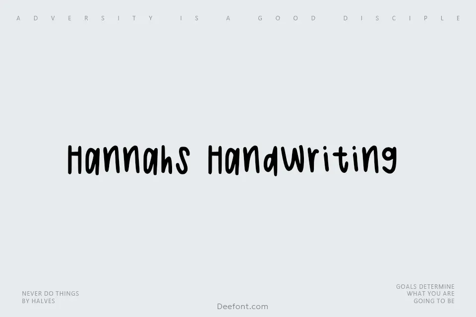 Hannahs Handwriting is a delightful handwritten typeface that captures the authentic charm of natural pen strokes and personal cursive elements. With its organic flowing letterforms, irregular baselines, and genuine calligraphic touches, this font conveys warmth and individuality ideal for casual design work. Perfect for poster headlines, invitation cards, scrapbooking, greeting cards, and creative titling, Hannahs Handwriting brings an intimate, human-crafted quality to any project seeking genuine personality over formal precision.