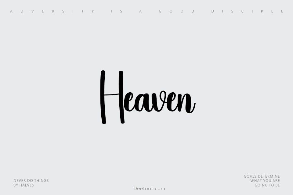 Heaven is a stylish script font designed for modern creative projects. Its elegant and flowing letterforms are ideal for branding, invitations, social media posts, packaging, and visual displays, offering a fresh and sophisticated handwriting feel. Perfect for those seeking an extraordinary, tastefully crafted typeface to highlight their work, Heaven stands out with its versatile and contemporary appeal.
