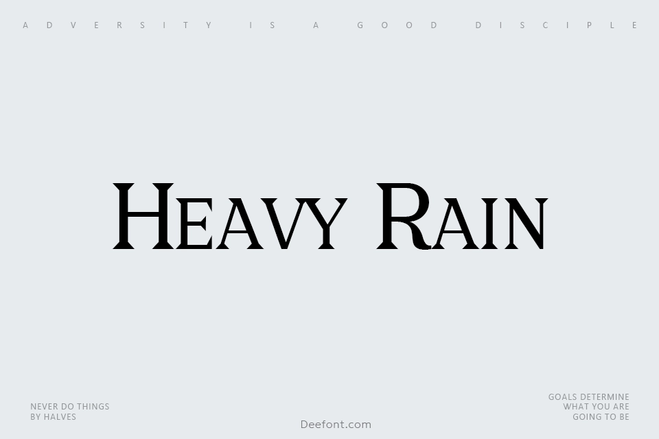 Heavy Rain is a distinctive decorative serif typeface designed for creative projects. With its classic medieval aesthetic and bold presence, this font combines historical elegance with modern versatility. Perfect for headlines, posters, and artistic designs that demand character and visual impact, Heavy Rain delivers sophisticated typography through its carefully crafted letter forms and semi-light weight construction.