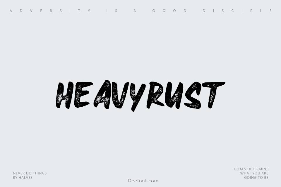 Heavyrust is an aggressive, bold brush-style display font that delivers striking visual impact with its characteristic distressed texture. Designed with dynamic strokes and rugged aesthetics, it embodies a hand-crafted appearance perfect for headers, flyers, product packaging, album covers, and branding projects. This typeface combines strength and character, making it an ideal choice for designs requiring a powerful, commanding presence that captures immediate attention.