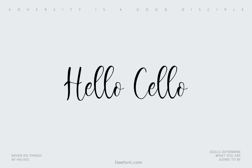 The Hello Cello font offers a stylish script calligraphy style, perfect for elegant design work and creative branding. Its unique curves and smooth lines give a hand-lettered touch, adding sophistication to invitations, logos, and posters. Designed for impactful personal projects, Hello Cello’s graceful strokes and artistic flair make it versatile for both digital and print use. Transform ordinary text into eye-catching compositions with Hello Cello’s distinctive charm.