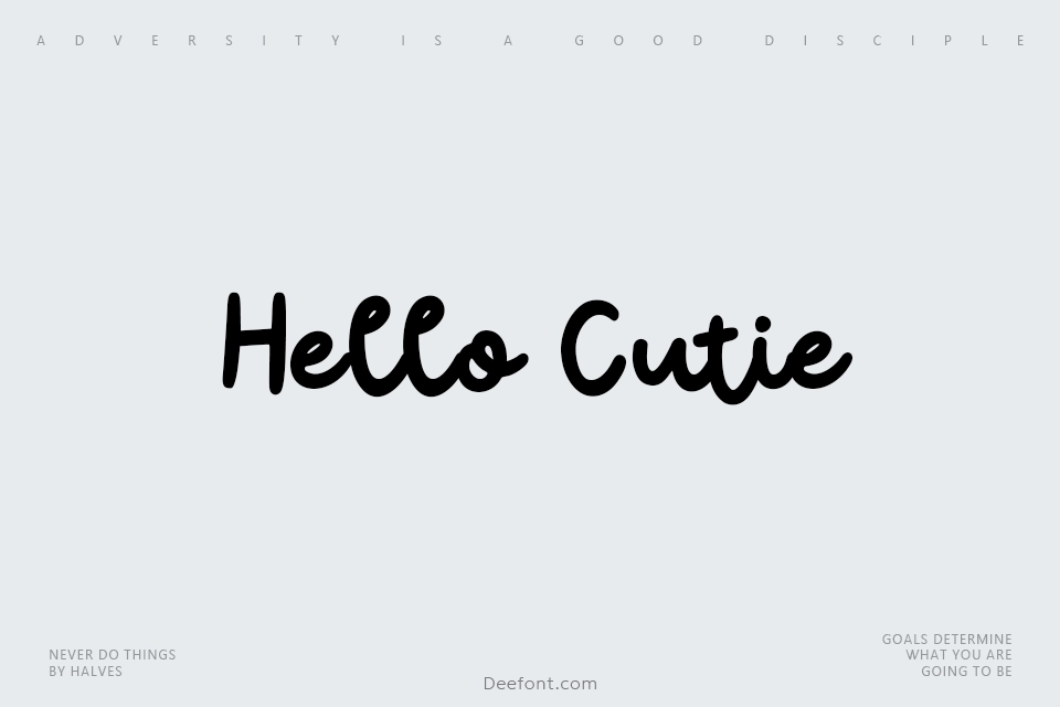 Hello Cutie is a delightful handwritten script font that combines playful elegance with modern charm. This cute typeface is perfect for adding personality to quotes, greeting cards, invitations, and creative branding projects. With its flowing, friendly letterforms and cheerful aesthetic, Hello Cutie brings warmth and character to any design, making it an ideal choice for projects requiring a gentle yet expressive touch.