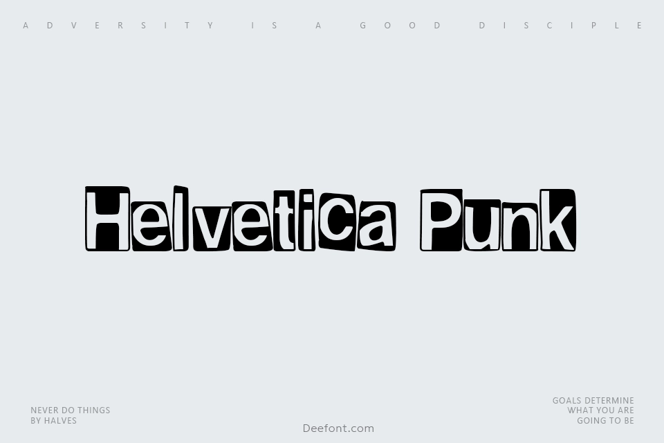 Helvetica Punk is a bold, punk-inspired display font featuring distinctive blocky, irregular character shapes with playful distortion. Created by Woodcutter, this decorative typeface combines modern edge with rebellious energy, making it ideal for headlines, album covers, posters, and streetwear branding. The font includes 236 characters with distinctive styling that captures the anarchic spirit of punk typography, perfect for creative projects demanding bold visual statements.