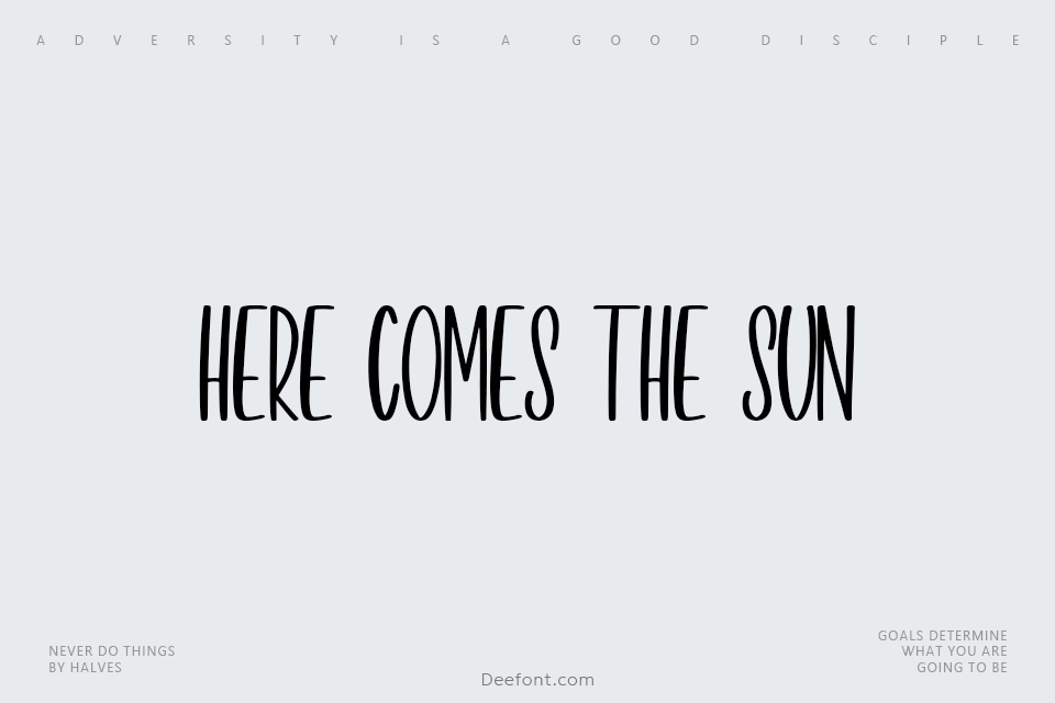 Here Comes The Sun is a fun and stylish handwritten display font designed for creative projects requiring personality and charm. Perfect for logos, branding, titles, social media posts, advertisements, product packaging, labels, and web design, this versatile typeface features both uppercase and lowercase letters with ligatures and decorative doodles. With multilingual support, it brings a contemporary edge to any typography project while maintaining timeless handwritten appeal. Ideal for designers seeking distinctive lettering that combines playfulness with professional polish for any creative endeavor.