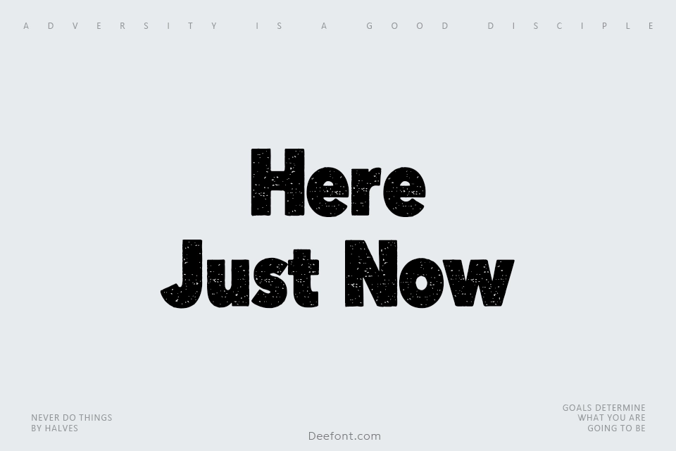 Here Just Now is a bold, distressed display font featuring a vintage, worn aesthetic with eroded textures and uniform character thickness. Designed with a grunge-inspired style, this decorative typeface excels at making impactful headlines and eye-catching graphics. The font’s rugged character and textured appearance add depth and personality to posters, logos, and branding projects. With its distinctive vintage charm and contemporary edge, Here Just Now is perfect for designs that require a touch of authenticity and creative energy.