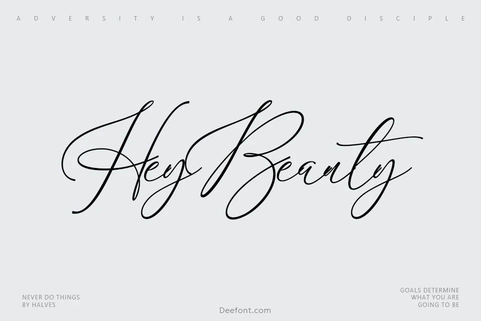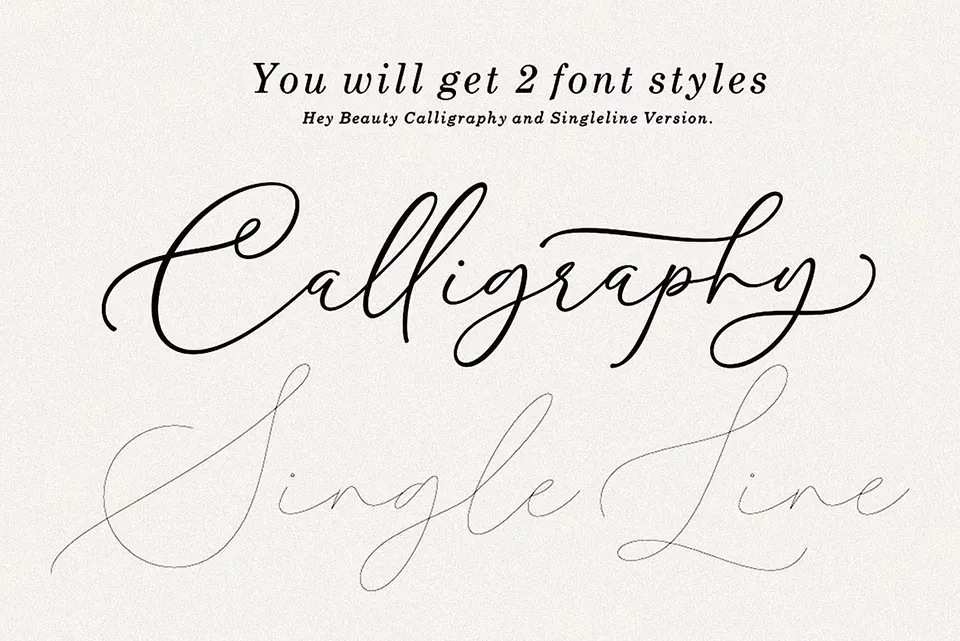 Hey Beauty Font is a beautiful calligraphy script designed to bring elegance and charm to your creative projects. With its handmade, organic strokes and balanced style, this font is perfect for romantic invitations, wedding materials, branding, and more. The font offers ligature glyphs and multilingual support, making it versatile and suitable for a wide range of uses. Fall in love with its distinct and timeless look, and let your designs shine with Hey Beauty Font.