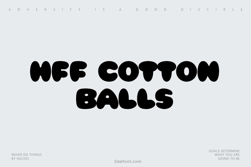 HFF Cotton Balls is a playful and bold display font featuring rounded, bubble-like characters with uniform stroke width. This whimsical typeface embodies a cartoon and comic style aesthetic, making it perfect for children’s materials, party invitations, and creative projects requiring a lighthearted appeal. The evenly spaced letters create a balanced and visually striking appearance that captures attention with cheerful charm.