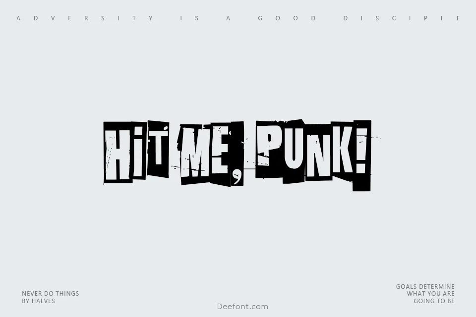 Hit me, punk! is a bold, distressed display font featuring a rebellious punk rock and DIY aesthetic. With its irregular letterforms, high contrast, and rough texture, this typeface creates a gritty, collage-like effect perfect for eye-catching headlines, posters, album covers, and edgy branding projects. Each character appears cut from magazines, delivering authentic punk energy and chaotic vitality to any design.