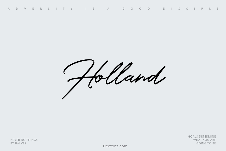 Holland is an elegant script handwriting font designed by Lettersiro Studio, characterized by smooth, flowing lines and a graceful signature style. This beautifully crafted typeface features delicate proportions and a dancing baseline, making it perfect for wedding invitations, greeting cards, branding, editorial designs, and upscale projects that require a touch of sophistication and personal flair.