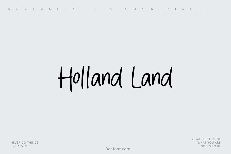 Holland Land is a graceful handwritten script typeface that combines elegant curves with contemporary charm. Designed for creative professionals, this versatile font delivers sophistication in signatures, branding, and typographic projects. With its flowing strokes and natural handwritten quality, Holland Land adds personality and warmth to any design composition while maintaining professional appeal.