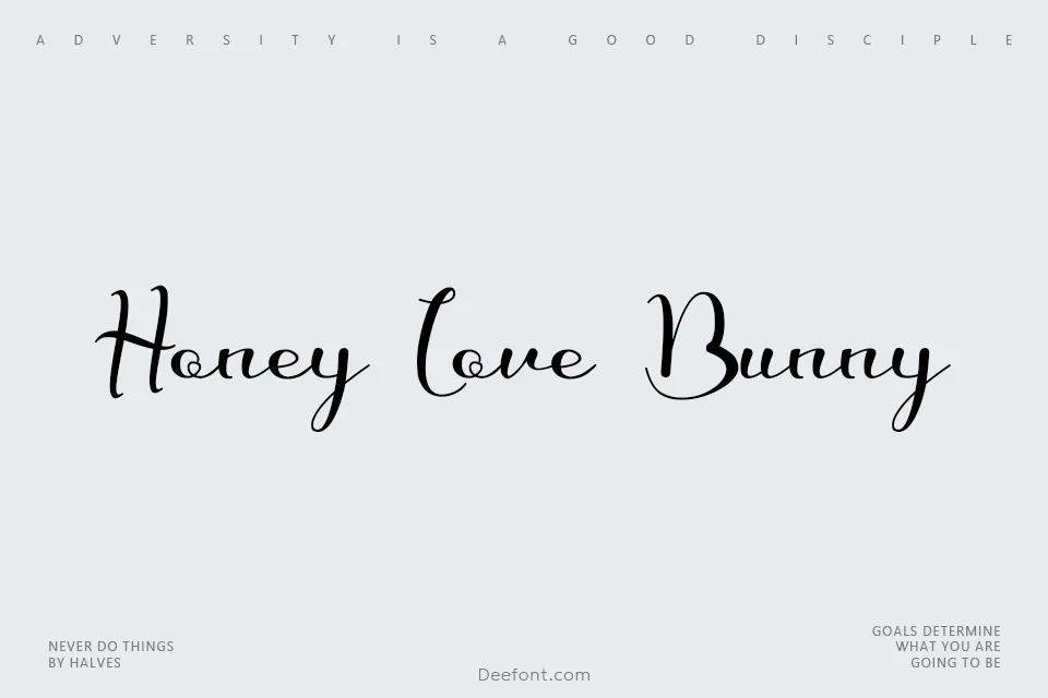 Honey Love Bunny is an elegant and flowing script font characterized by graceful, cursive letterforms with delicate loops and swirls that add sophistication. Each character features fluid and graceful design elements, making it perfect for personal, handwritten touches. The font’s charming aesthetic includes smooth curves and stylish numerals, ideal for wedding invitations, greeting cards, logos, and branding materials requiring an elegant, feminine touch to elevate your creative projects with distinctive charm and refinement.