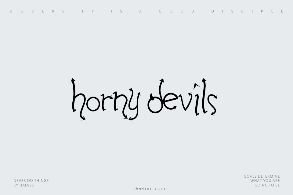 Horny Devils is a playful and whimsical display font featuring devilish elements with horns and tails integrated into cartoonish, hand-drawn characters. This decorative typeface showcases fun, mischievous embellishments with uneven strokes that create a quirky and informal aesthetic. Perfect for Halloween-themed designs, playful branding, children’s book covers, and themed party decorations, it brings a lighthearted and humorous touch to creative projects requiring distinctive visual personality and distinctive character style.