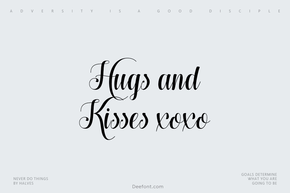 Hugs and Kisses xoxo is an elegant script font featuring 269 glyphs with beautiful calligraphic strokes, perfect for invitations, logos, greeting cards, and creative projects. This versatile typeface combines handwritten charm with refined elegance, offering excellent language support across multiple alphabets. Originally designed in 2015 and released in 2016, the font delivers sophisticated typography for both decorative and functional design applications.
