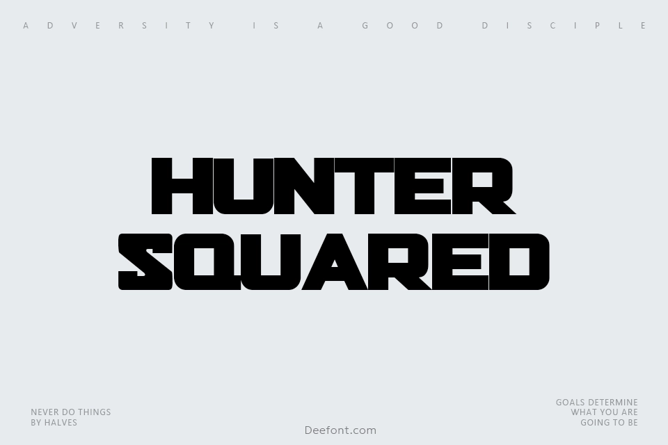 Hunter Squared is a bold, geometric, and modern display font designed with squared, blocky characters that deliver a contemporary aesthetic. Created by TracerTong Fontworks, this techno-inspired typeface features a distinctive futuristic style with clean lines and angular shapes. The font is highly versatile for digital designs, technological branding, and creative projects requiring a strong, industrial appearance. Its geometric precision makes it ideal for headlines, titles, and eye-catching typography that commands visual attention while maintaining excellent legibility at various sizes.