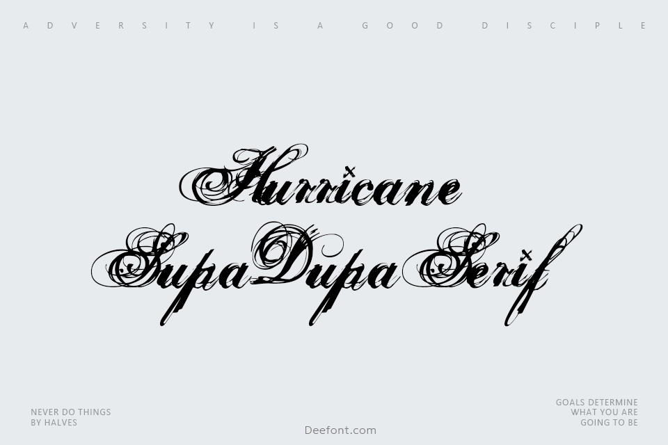Hurricane SupaDupaSerif is an ornate and highly decorative script font characterized by its intricate swirls, elaborate flourishes, and exaggerated loops that extend gracefully from each letter. The font features particularly elaborate uppercase letters with embellishments that convey a sense of grandeur and elegance, while lowercase letters maintain the decorative style with improved readability. This sophisticated typeface exudes luxury and refinement, making it ideal for wedding invitations, luxury brand logos, high-end product packaging, decorative headlines, and elegant design projects that require a touch of flair and artistic expression.