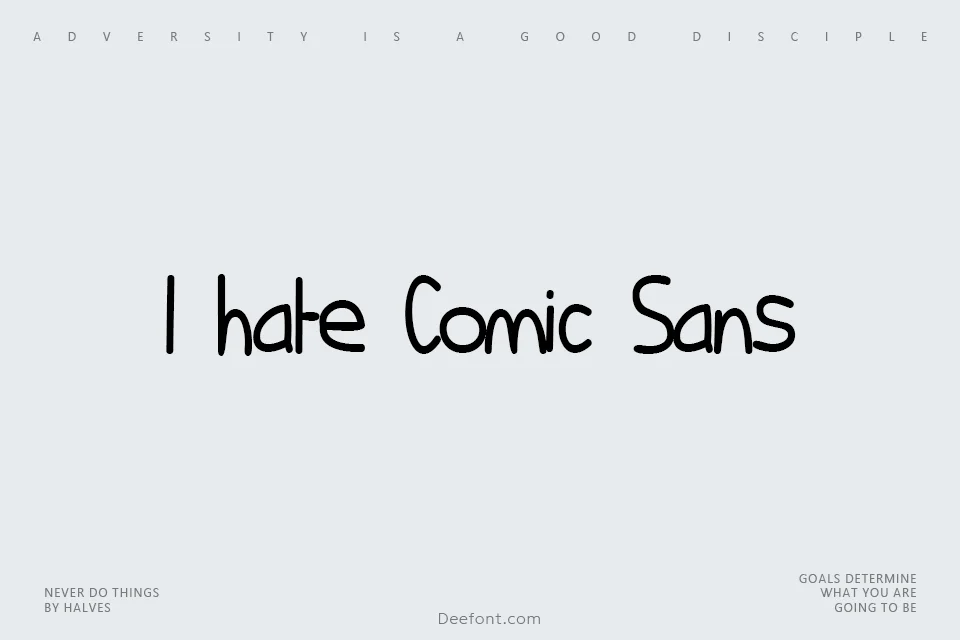 I hate Comic Sans is a playful and humorous fancy font that parodies the notorious Comic Sans typeface. Designed with a comic style, this font features bold, rounded letterforms that evoke the childlike and informal aesthetic of its namesake. Perfect for creative projects requiring a lighthearted, casual, and whimsical touch, this typeface brings personality and charm to designs, invitations, and informal communications. Despite its satirical nature, the font delivers excellent readability with its distinctive character shapes.