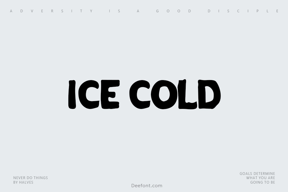 Ice Cold is a bold and quirky display font designed with friendly characters and a cool, eye-catching style. This versatile typeface features distinctive snow-cap details and is perfect for headlines, signage, creative branding, and crafty design ideas. With its contemporary flair and playful aesthetic, Ice Cold adds a unique visual impact to any project, making it ideal for decorative typography and attention-grabbing designs that demand a modern yet whimsical touch.