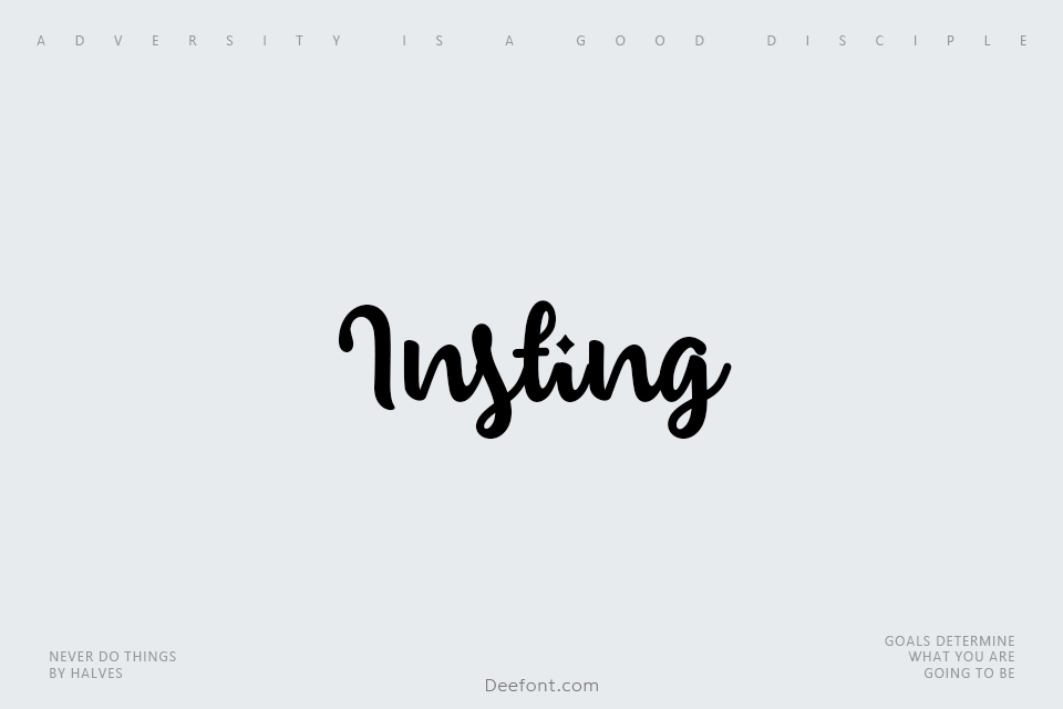 Insting is an elegant and bold script font with a playful handwritten style. Designed with connected letters creating a fluid and continuous look, this typeface combines casual elegance with ornate uppercase letters and rounded lowercase forms. The font features contextual alternates and full support for numbers and symbols, making it ideal for greeting cards, invitations, logos, and branding materials that require a personal and whimsical touch. Its distinctive character set includes over 230 glyphs supporting 39 languages, offering excellent versatility for creative typography projects.