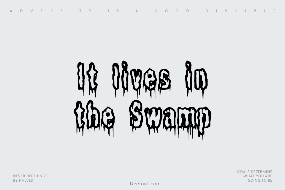 It lives in the Swamp is a creative display font designed by Ænigma, featuring a playful dripping aesthetic that brings a distinctive character to your typography. This horror and fancy-themed typeface delivers unique, eye-catching designs perfect for posters, game interfaces, and creative projects. With its 97 glyphs and custom character mapping, it offers reliable support for standard Latin characters, making it ideal for designers seeking unconventional and memorable visual communication.