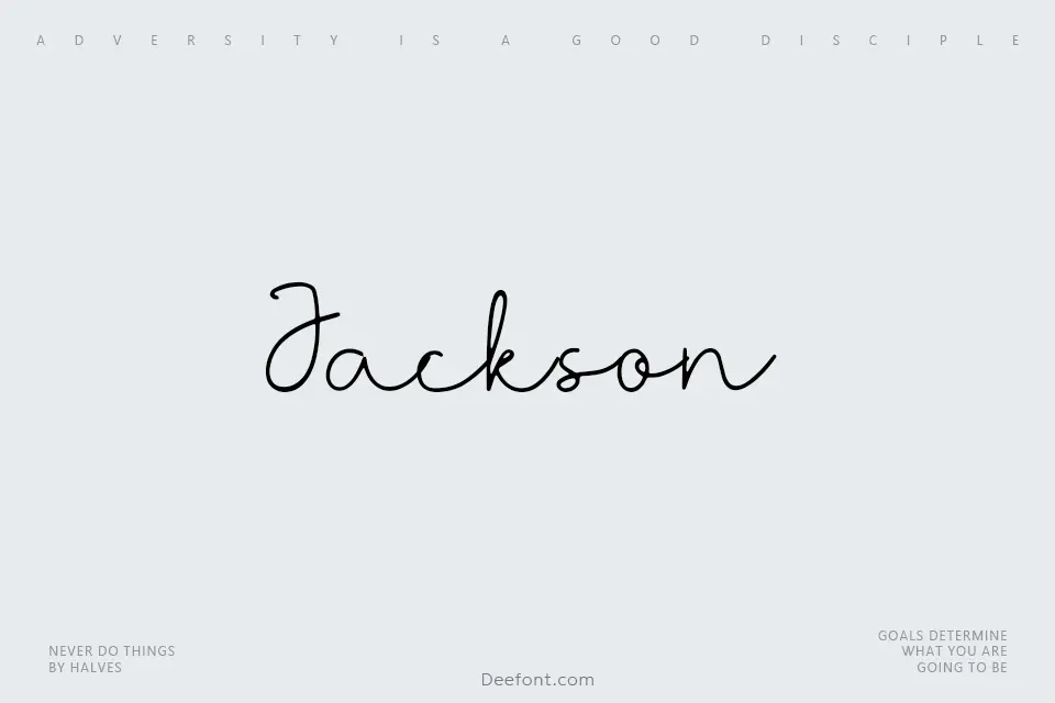 Jackson Font is a fresh, modern handwritten script with authentic calligraphy styling and ornamental character variations. Its expressive dancing baseline and artistic letterforms excel in invitation design, greeting cards, poster headlines, and creative branding applications. The typeface combines handmade elegance with contemporary design sensibility, making it ideal for projects requiring personal, decorative typography that captures attention while maintaining readability and artistic appeal across both print and digital media.