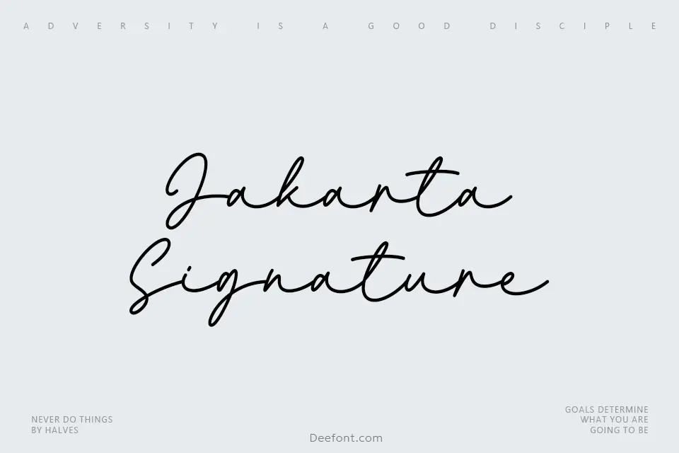 Jakarta Signature is an elegant handwritten signature font with smooth monoline strokes, natural rhythm and refined curves that evoke a modern, personal touch. Its flowing letterforms and stylish ligatures make it ideal for luxury branding, logo marks, wedding invitations, packaging, beauty products, quotes and social media graphics. Use it whenever a sophisticated handwritten signature style is needed to elevate visual storytelling.