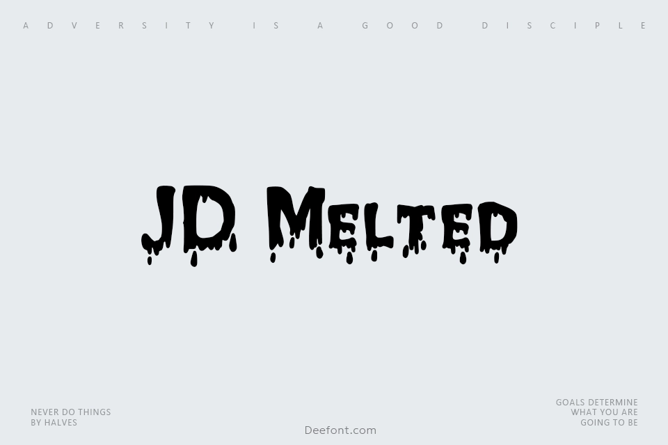JD Melted is a distinctive decorative display font featuring a unique dripping and melting effect that gives letters the appearance of slowly dissolving liquid. With bold, thick strokes and dramatic visual impact, each character displays characteristic liquid drops hanging from edges, creating a dynamic and eye-catching aesthetic. The font maintains consistent styling across uppercase and lowercase letters, numbers, and special characters, ensuring readability while delivering powerful visual presence. Ideal for Halloween-themed designs, horror-inspired projects, posters, edgy branding, and any design requiring striking attention-grabbing typography that stands out.